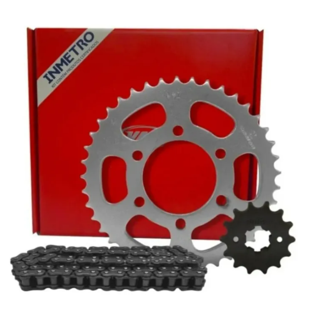 Coroa é fabricada a partir de um aço de alta resistência que na sequência é temperado e fica com a dureza igual a da coroa original que vem na sua moto. Pinhão é fabricado a partir de um aço microligado que na sequência é carbonitretado e fica com a dureza igual a do pinhão original que vem na sua moto.