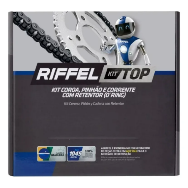 O Kit Relação TOP possui corrente com retentor, permitindo ao cliente um maior uso do kit, pois o retentor faz com que a corrente demore a frouxar, tendo assim uma maior durabilidade da peça. Padrão das linhas de montagem e Certificação Inmetro.